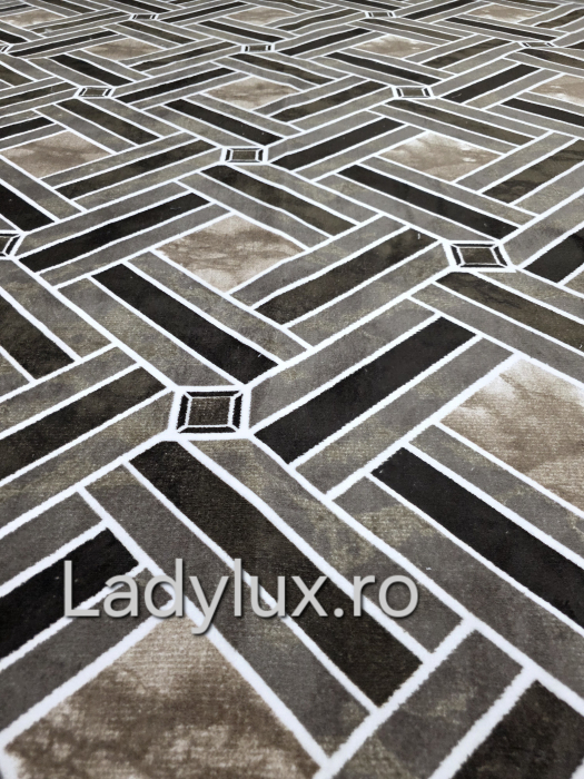 Nuanțele de maro cald adaugă profunzime și echilibru vizual, creând o atmosferă primitoare și relaxantă. Datorită bazei cauciucate, covorul rămâne fixat pe podea, prevenind alunecarea și oferind siguranță sporită în orice tip de spațiu.
