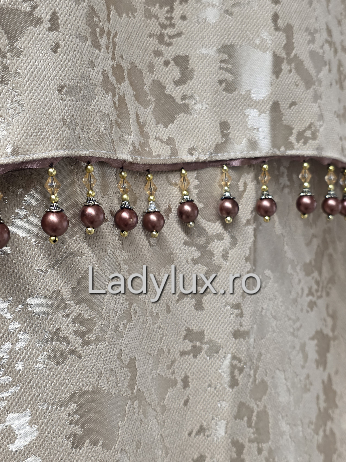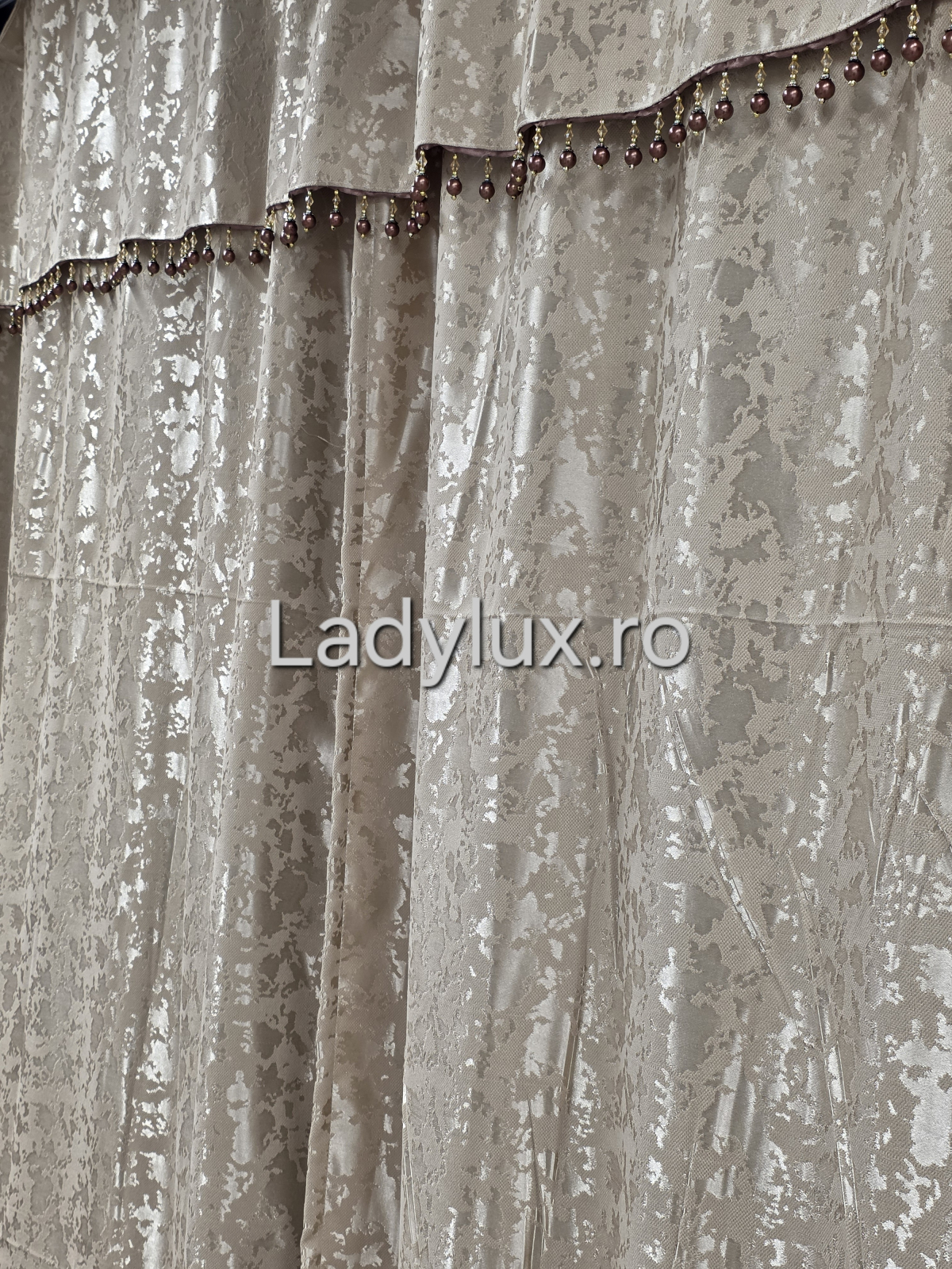 În partea superioară, draperiile sunt decorate cu bordură cu ciucuri albi, care adaugă un plus de stil și un detaliu decorativ deosebit, ideal pentru un ambient elegant.