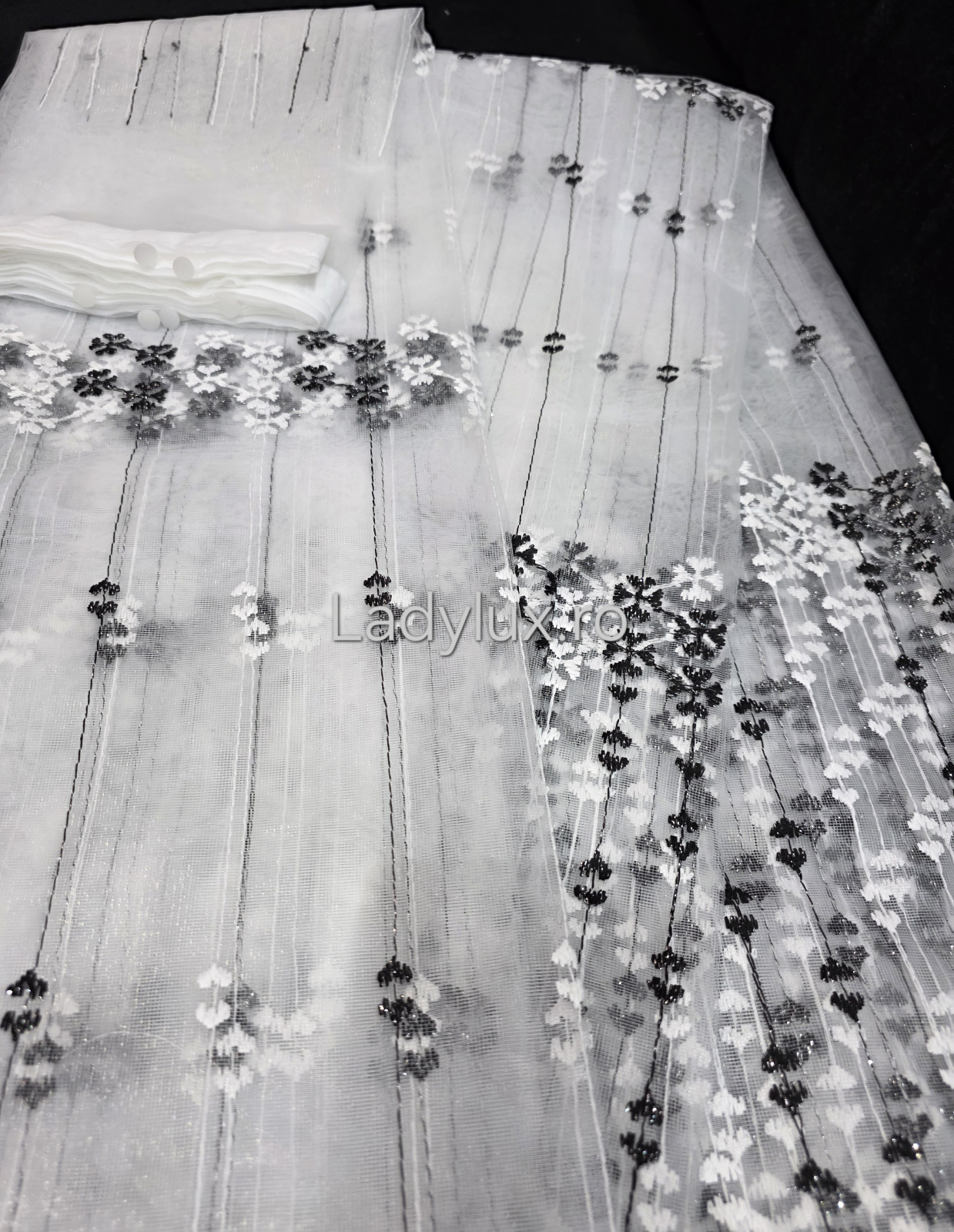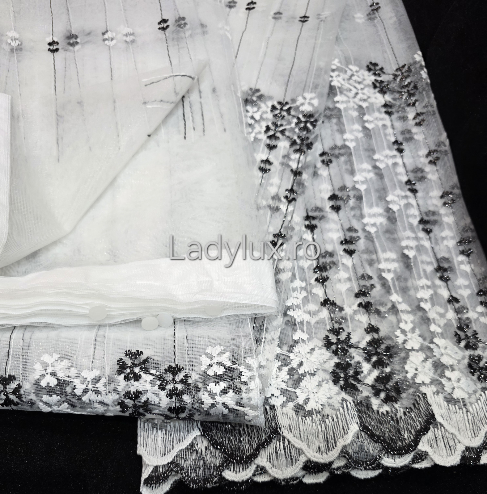 Materialul transparent din tulle lasă lumina naturală să pătrundă armonios, în timp ce broderia neagră adaugă contrast și stil contemporan. Ideală pentru living, dormitor sau spații elegante, această perdea completează perfect decorurile moderne sau clasice.