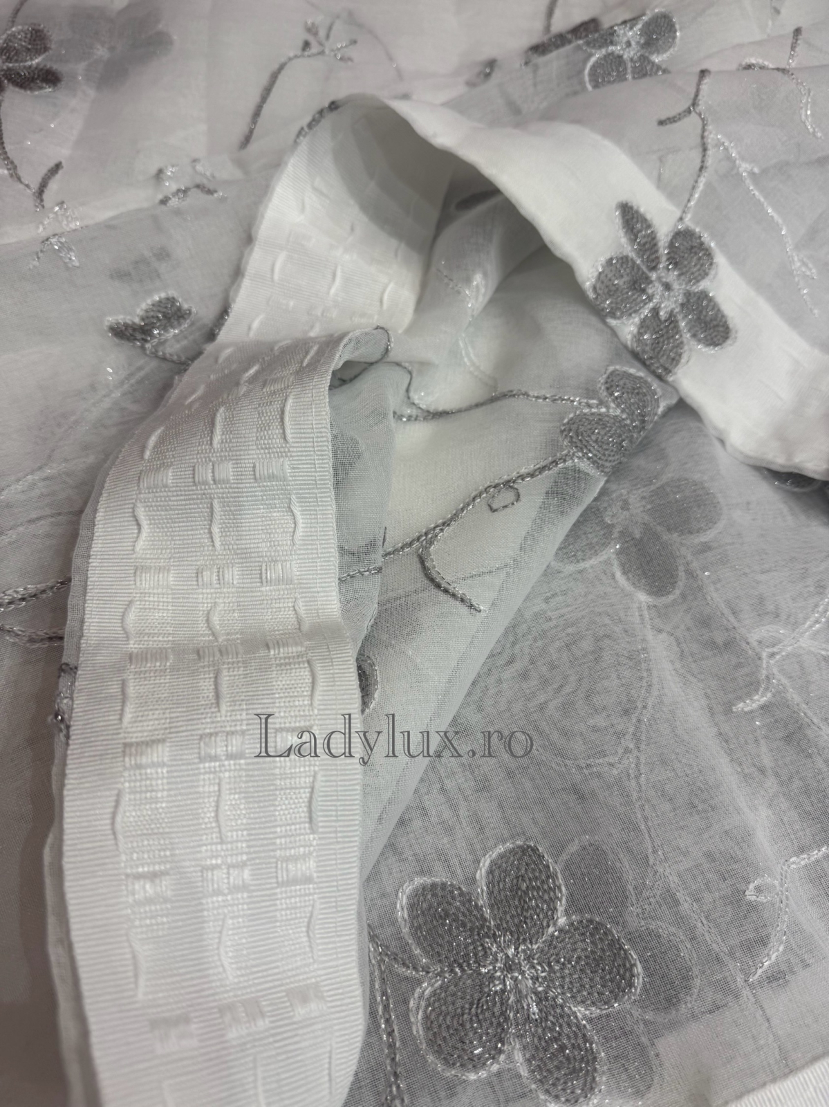 Perdeaua este prevăzută cu bandă de încrețire lată, oferind cădere frumoasă și posibilitatea de a se potrivi cu diverse sisteme de prindere (cârlige, șină, galerie).