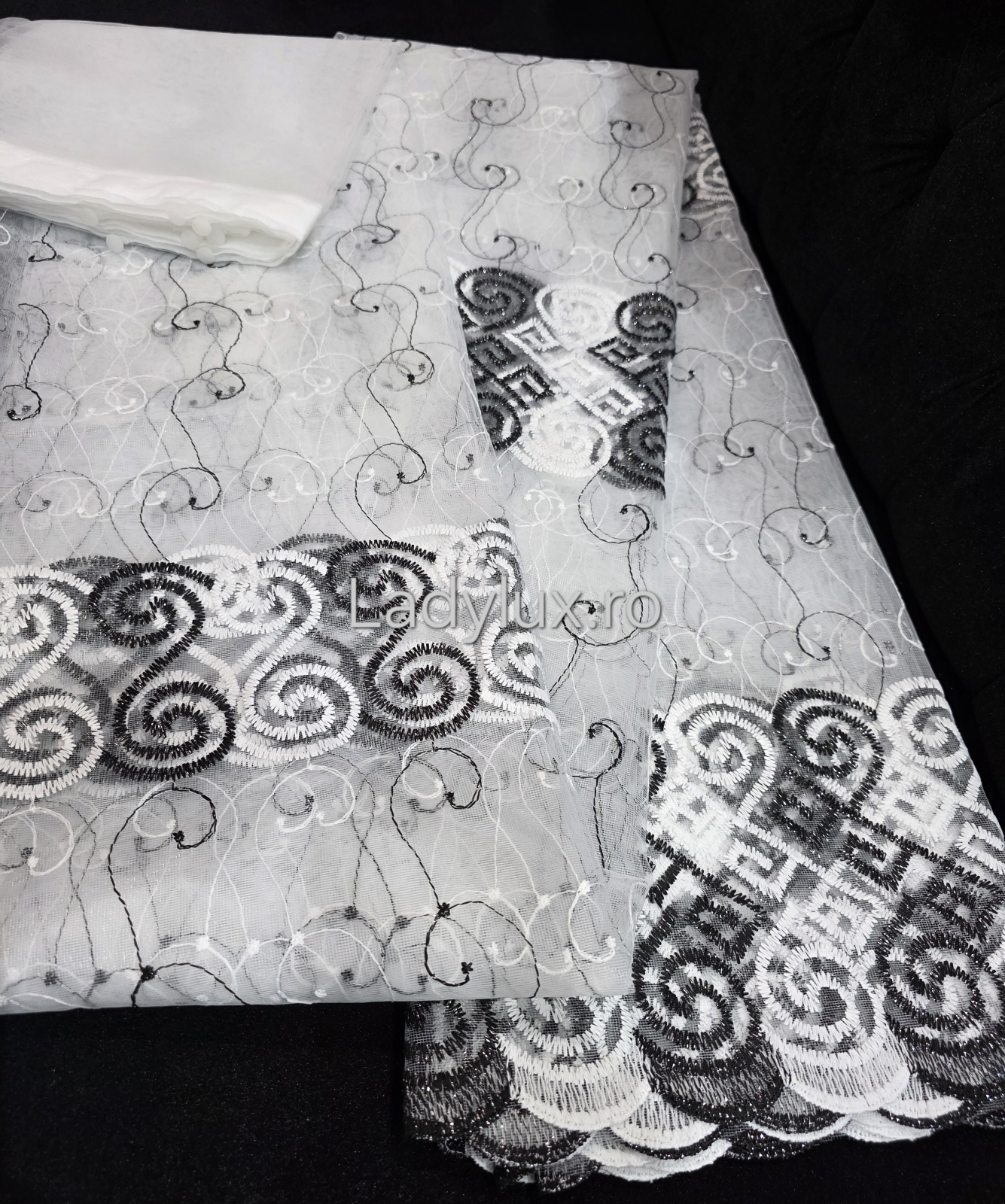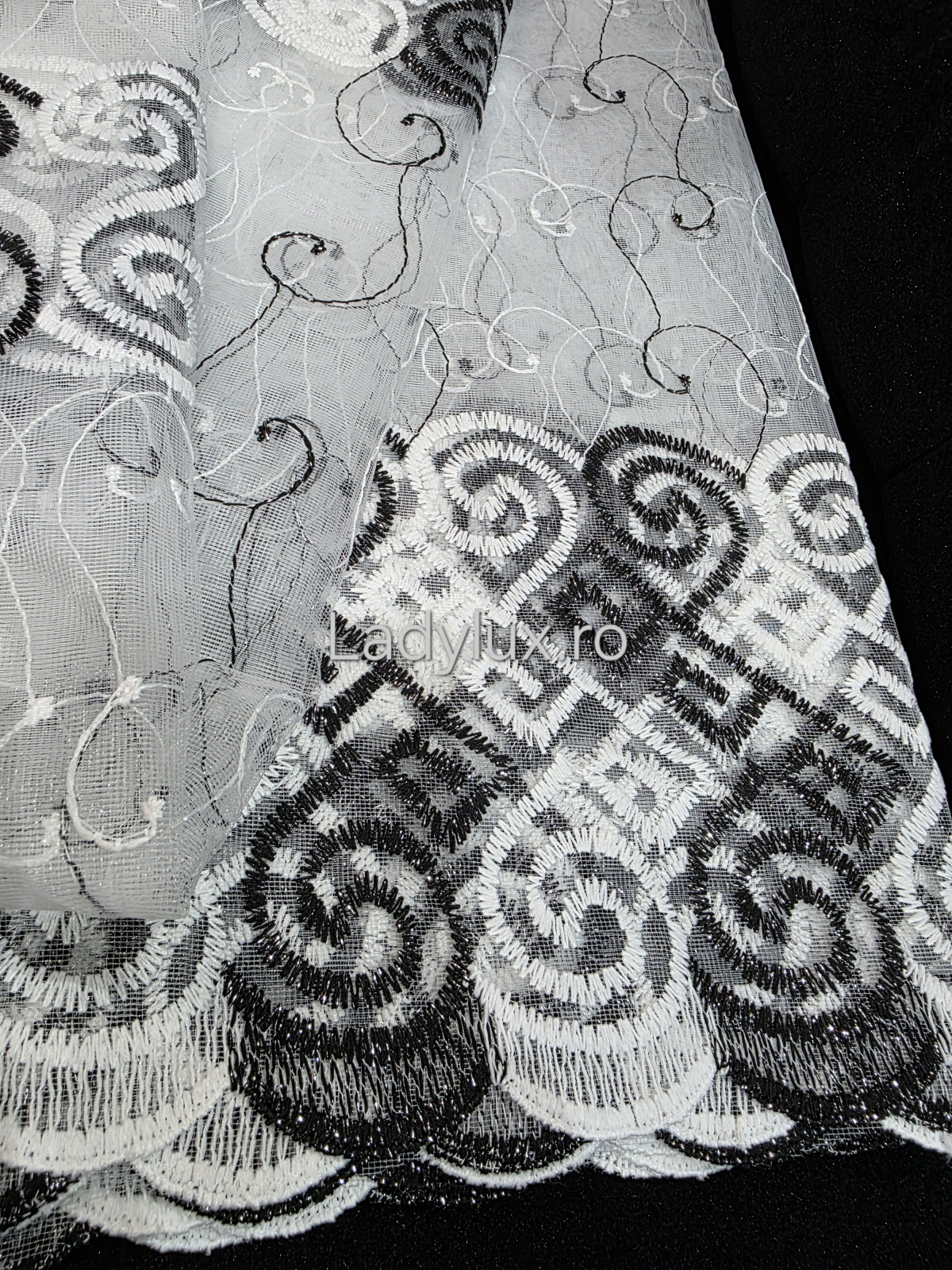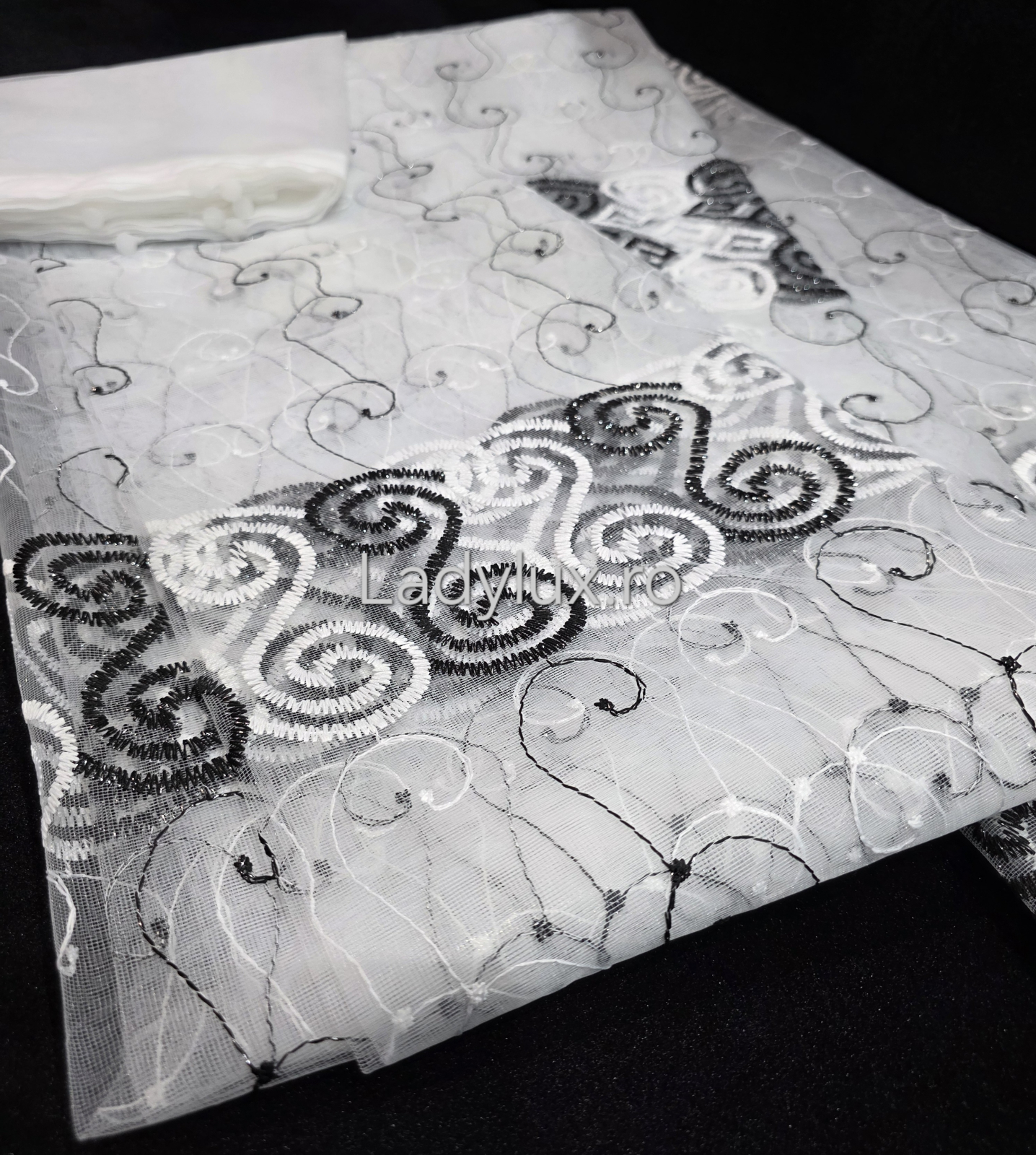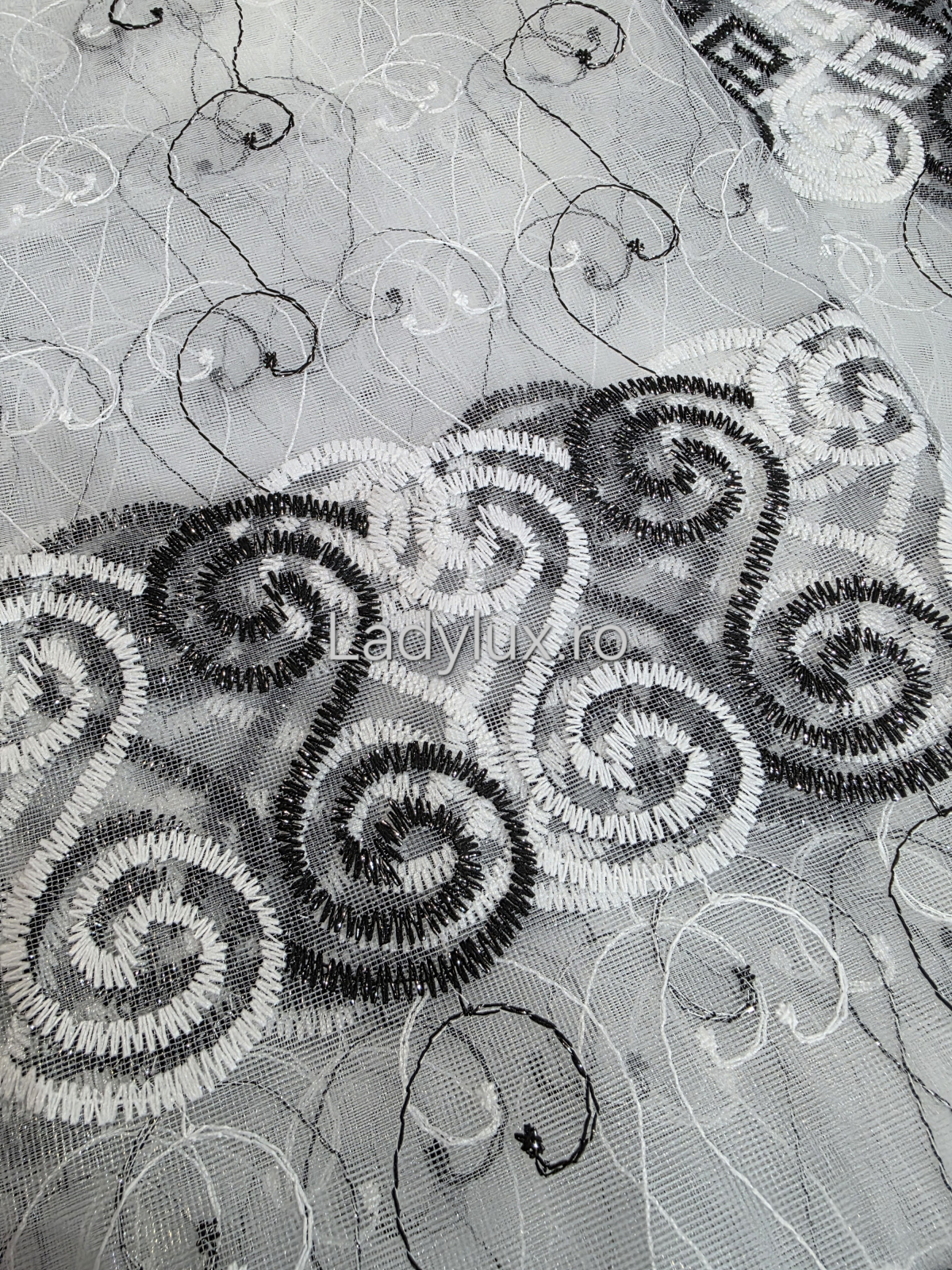 Materialul transparent din tulle lasă lumina naturală să pătrundă armonios, în timp ce broderia neagră adaugă contrast și stil contemporan. Ideală pentru living, dormitor sau spații elegante, această perdea completează perfect decorurile moderne sau clasice.