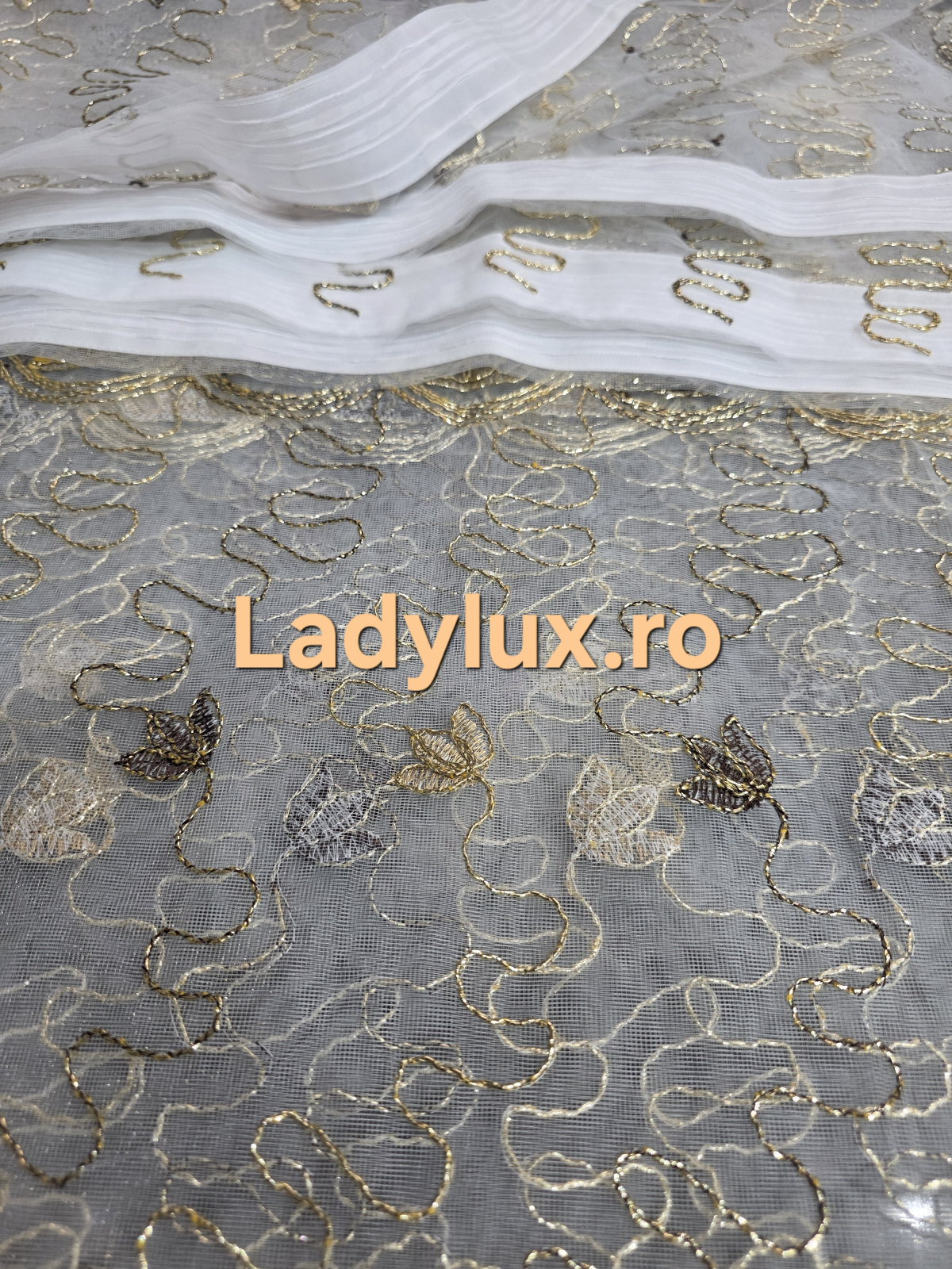 Perdea din tull, broderie aurie– rafinament și strălucire discretă, 3 M x 2.5h gata cusuta cu tiv si rejansa
