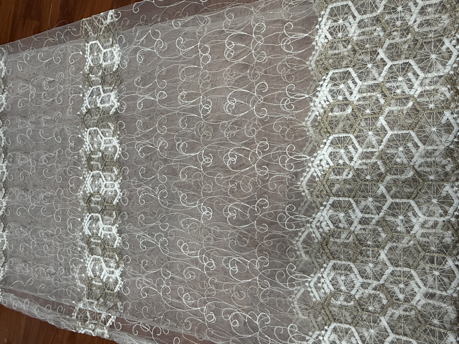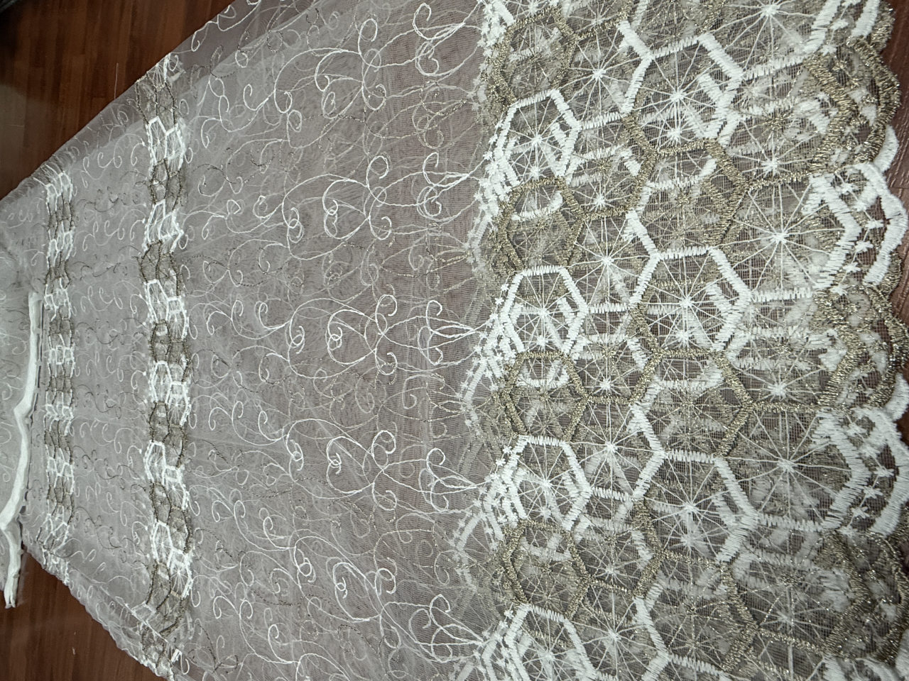 Perdea Tulle cu Broderie Capucino+Alb Model Hexa - Cu Tiv si Rejansa - 3M x 2.5h