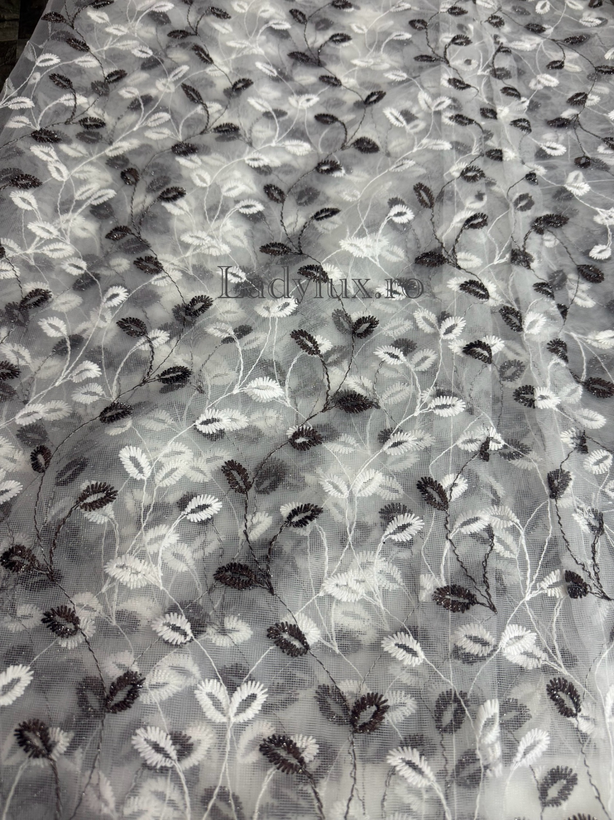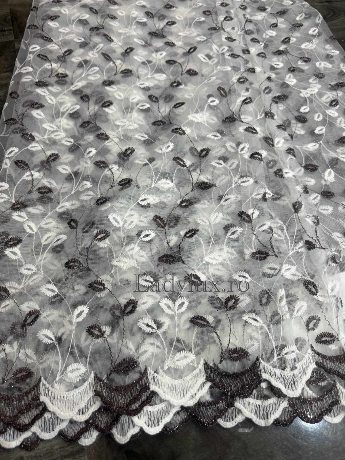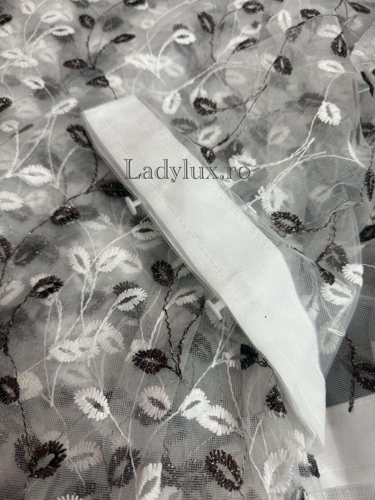Perdea din tulle cu broderie Brawn+bej , model frunze, gata făcută cu tiv și rejansă C1593